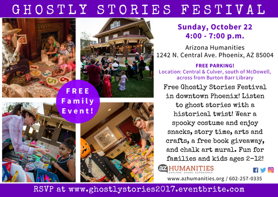 Free Ghostly Stories Festival in downtown Phoenix! Listen to ghost stories with a historical twist! Wear a spooky costume and enjoy snacks, story time, arts and crafts, a free book giveaway, and chalk art mural. Fun for families and kids ages 2-12!