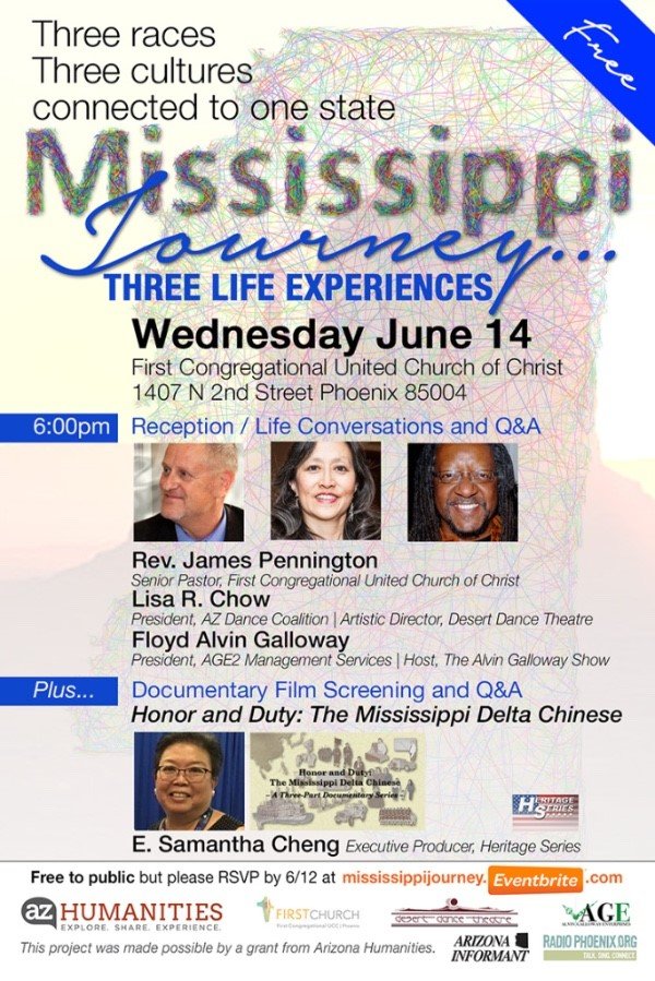 Mississippi Journey: Three Life Experiences, tells the life journey of three Arizona residents with deep roots in the Magnolia state. From very different cultural and ethnic backgrounds, Rev. James Pennington – Pastor at First Congregational United Church of Christ, Lisa Chow – Artistic Director of Desert Dance Theatre and Floyd Alvin Galloway – Owner of AGE2 Management Services will share experiences that they have found in common that have connected them in their life through their journey from Mississippi to Arizona.